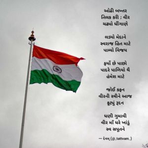 શીર્ષક : વીર ઓઢી બખ્તર તિલક કરી ; વીર ચઢ્યો ધીંગાણે લડ્યો મેદાને સ્વરાજ હિત માટે પામ્યો વિજય ફર્યો છે પાછો પાદરે પાળિયો થૈ હંમેશ માટે જોઈ કફન વીરની સ્ત્રીને આજ ફૂટ્યું રૂદન ધણી ગુમાવી વીર માઁ ધરે ખાંડું સ્વ સપૂતને. -દેવમ સંઘવી "તત્ત્વમ્"