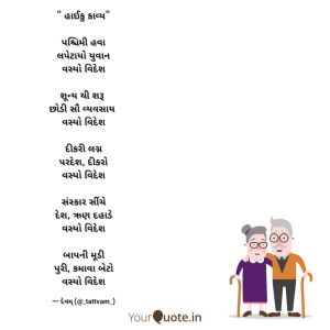 "હાઈકુ કાવ્ય" પશ્ચિમી હવા લપેટાયો યુવાન વસ્યો વિદેશ શૂન્ય થી શરૂ છોડી સૌ વ્યવસાય વસ્યો વિદેશ દીકરી લગ્ન પરદેશ, દીકરો વસ્યો વિદેશ સંસ્કાર સીંચે દેશ, ઋણ દહાડે વસ્યો વિદેશ બાપની મૂડી પુરી, કમાવા બેટો વસ્યો વિદેશ -દેવમ સંઘવી "તત્ત્વમ્"